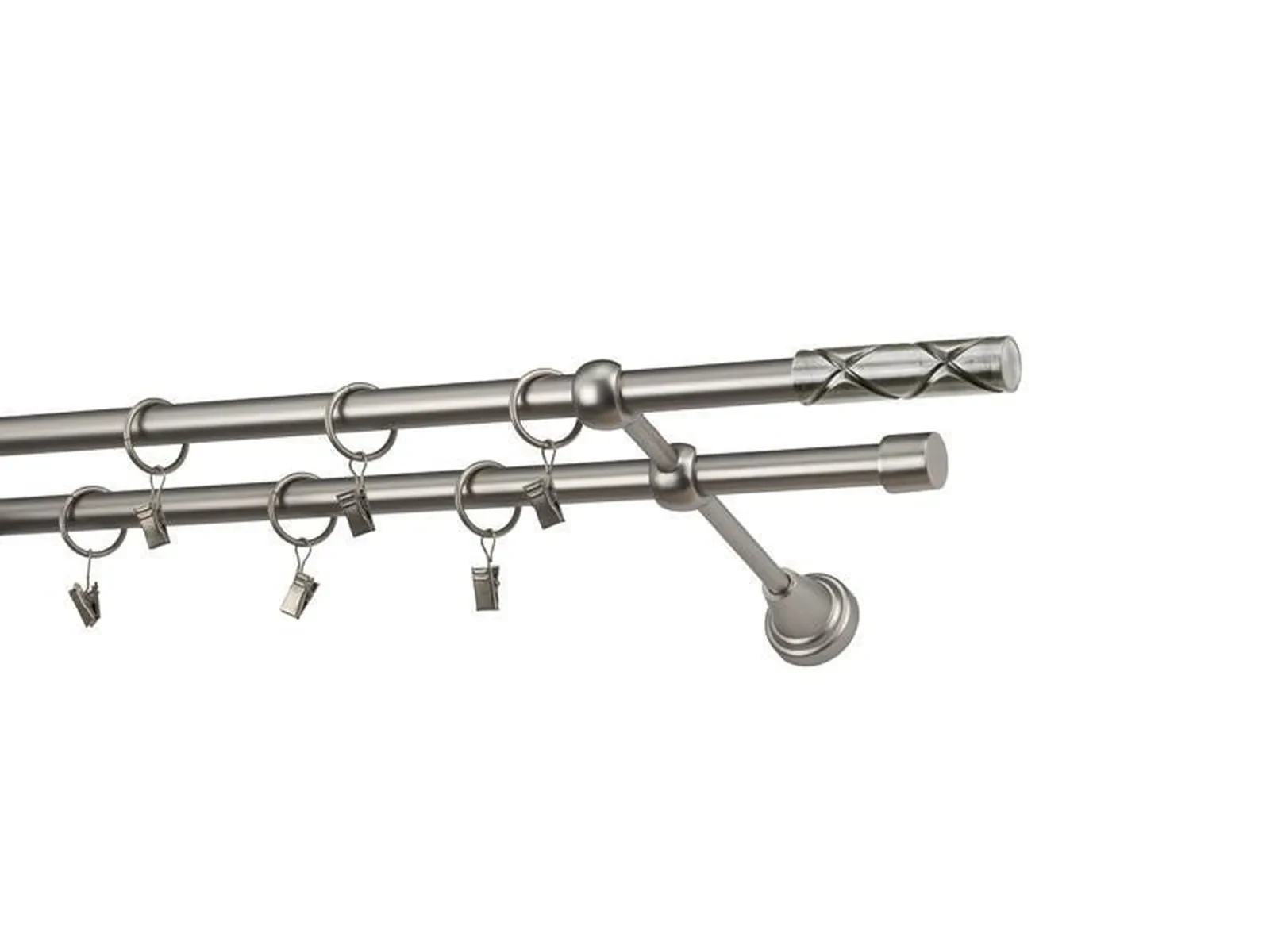 Dvojradová garniža s povrchovou úpravou - odtieň satin-nikel (matné striebro). Celokovové garniže s kvalitnou povrchovou úpravou - galvanické pokovovanie. Galvanické pokovovanie zabezpečuje vyššiu povrchovú tvrdosť, zvýšenú dolnosť voči poškriabaniu, hladký povrch. Dodávané sú v kompletoch.