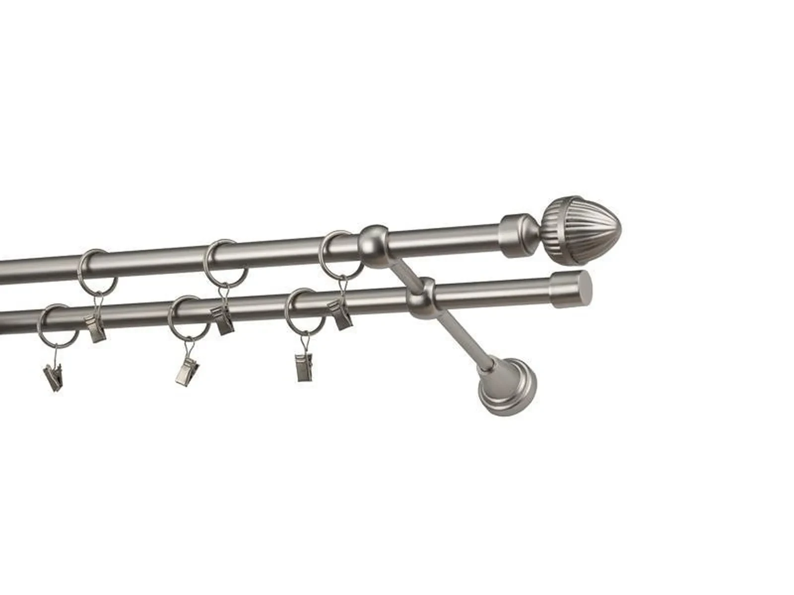 Dvojradová garniža s povrchovou úpravou - odtieň satin-nikel (matné striebro). Celokovové garniže s kvalitnou povrchovou úpravou - galvanické pokovovanie. Galvanické pokovovanie zabezpečuje vyššiu povrchovú tvrdosť, zvýšenú dolnosť voči poškriabaniu, hladký povrch. Dodávané sú v kompletoch.