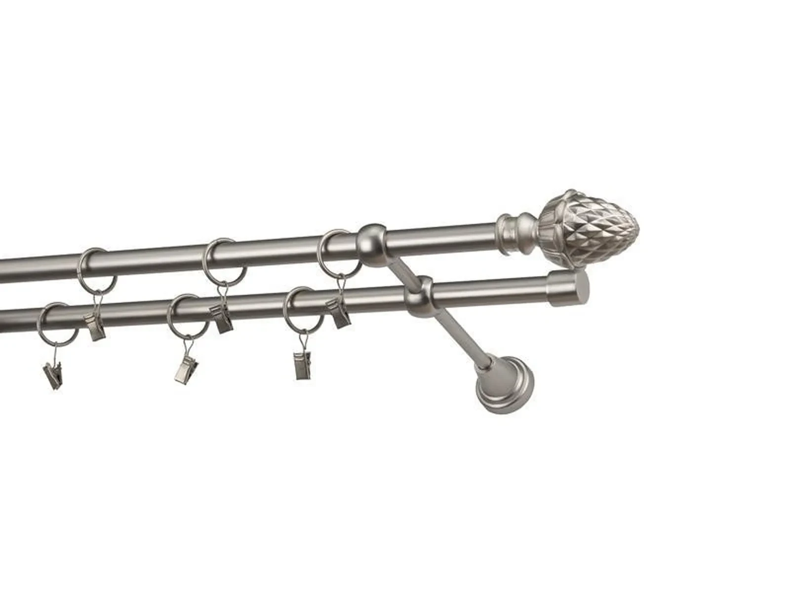 Dvojradová garniža s povrchovou úpravou - odtieň satin-nikel (matné striebro). Celokovové garniže s kvalitnou povrchovou úpravou - galvanické pokovovanie. Galvanické pokovovanie zabezpečuje vyššiu povrchovú tvrdosť, zvýšenú dolnosť voči poškriabaniu, hladký povrch. Dodávané sú v kompletoch.
